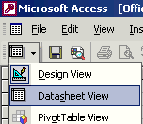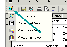 STEP 2: Access allows you to work in two basic views: Design View and Database View. You have been working in the Database View, where you can add and change records. Let's go to the Design View, where you can define and modify fields. Click on the Design View Icon and select Design View from the list.