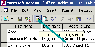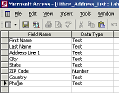 The Access file you opened has seven fields defined: First Name, Last Name, Address Line 1, City, State, Zip Code, and Country.