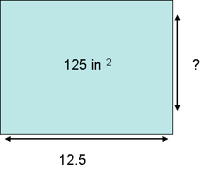 Think about it. If you multiplied 2 numbers to find the area, now you have to reverse that process. You have to divide the area by one of the sides to find the remaining side. You would have to divide 125 by 12.5. The process looks like the following equation (number problem).