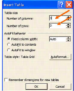 In the window (box) that appears, use the arrows or write in the numbers 3 (for columns) and 2 (for rows.) and click OK. |