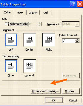 Then click the Shading tab. From that window, select CELL under the "Apply To" selections. Go to the "Fill" options and click on the blue you see selected on the right. As you create your own table, notice the "More Colors" selection. That will give you a much greater choice of colors for your cells. If you chose to "Apply to" the table, the whole table would change to the color you selected. |