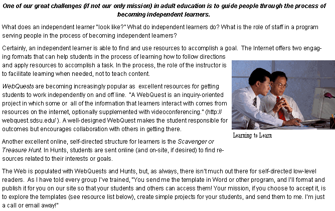 Scavenger/Treasure Hunts http://sesd.sk.ca/teacherresource/online%20inservice/Introduction/Introduction.htm - (Detailed Web Tutorial)Click on "Scavenger Hunt" and the very bottom. http://www.uen.org/utahlink/activities/view_activity.cgi?activity_id=6514 - A Scavenger Hunt on "Reeling in that Perfect Job!" - Good ABE/GED activity.