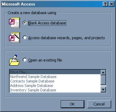 Activity 1- Open and save a database file. NOTE: In Access, you must save a file before you can create records. STEP 1: Open Access on your computer. Go to START -> PROGRAMS -> MICROSOFT ACCESS. [You will now have to toggle (go back and forth) between this Task and your program. Click ALT +TAB to go between the two windows.] STEP 2: When Access opens, you will have some options. If you are using Access 2002 or XP, you will see a panel open. If you are using earlier versions of Access, you may see a window open. In either case, select NEW -> Blank Database. A box will open asking you to save your file. Save it on your computer as "your initialsdb1.mdb." For example, if Bob Barley were saving it, he would call it "bbdb1.mdb" (for bobbarelydatabase1). A window will open showing you a blank table in Access. You will use this database in your next Access Task. Activity 2 - Open a completed database. Substitute new records for the data entered. STEP 1: Click on the arrow below to open a database with fields entered for FIRST NAME, LAST NAME, ADDRESS LINE, CITY, STATE, ZIP CODE AND COUNTRY. When you click on the arrow, a window will appear. Select SAVE, and save the file, AddressList.mdb, to your computer.